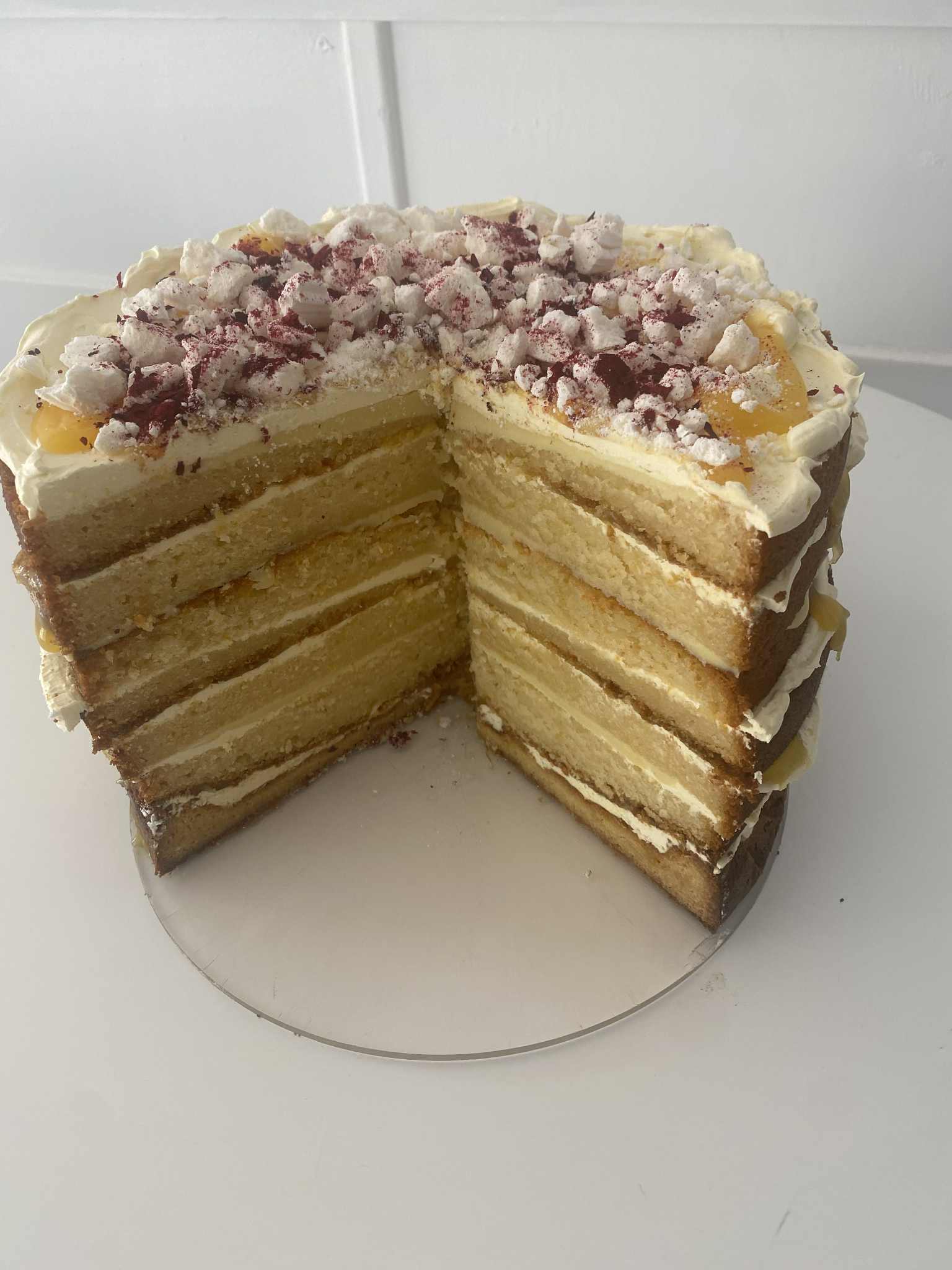 Multiple layers of lemon cake layered with swiss meringue buttercream icing, white chocolate ganache and layered with lemon curd on a lemon brownie base, crushed meringues on top with freeze dried raspberries