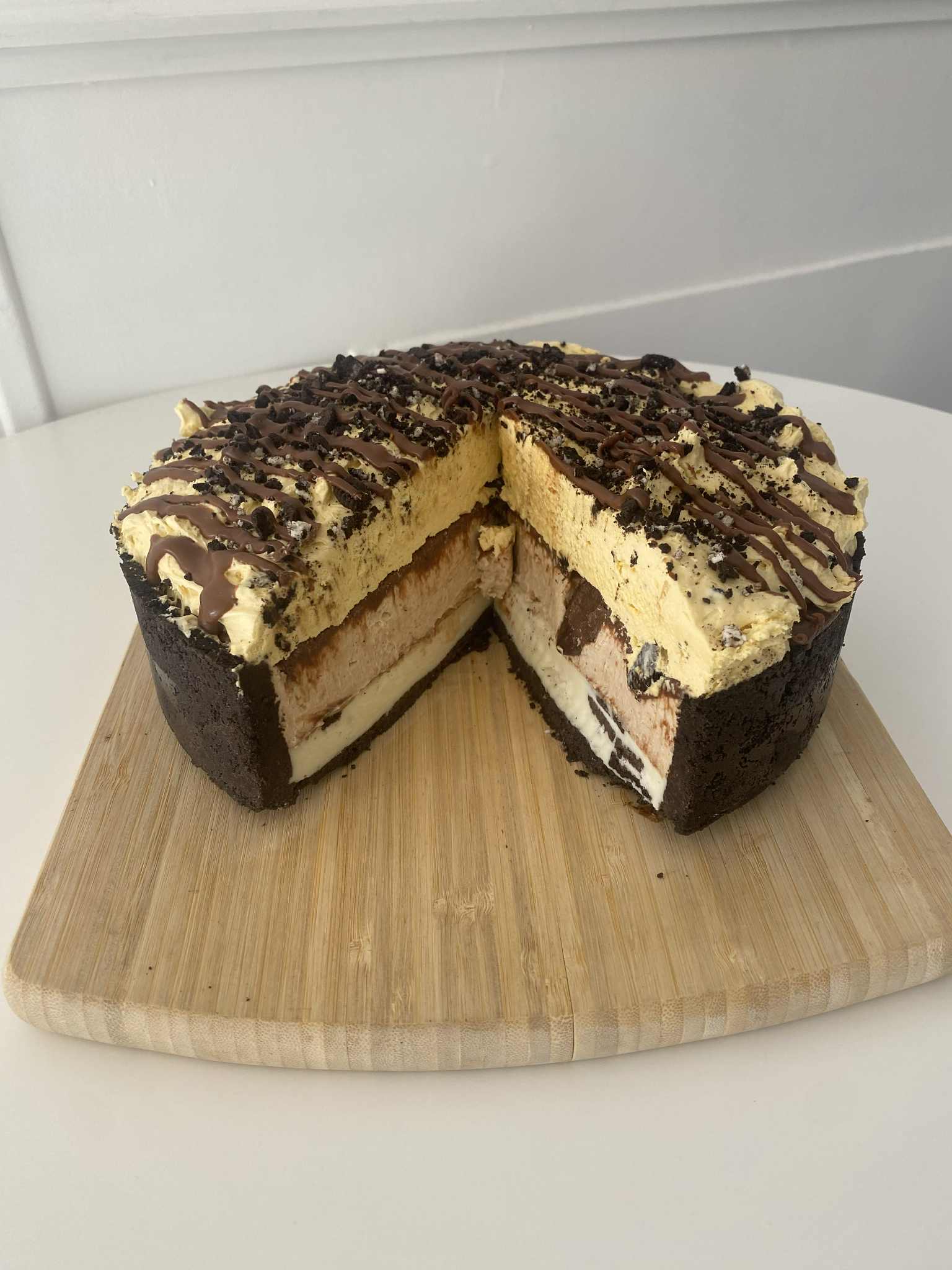 Oreo biscuit base, white chocolate truffle, oreo cheesecake, chocolate ganache, mousse & crushed oreos