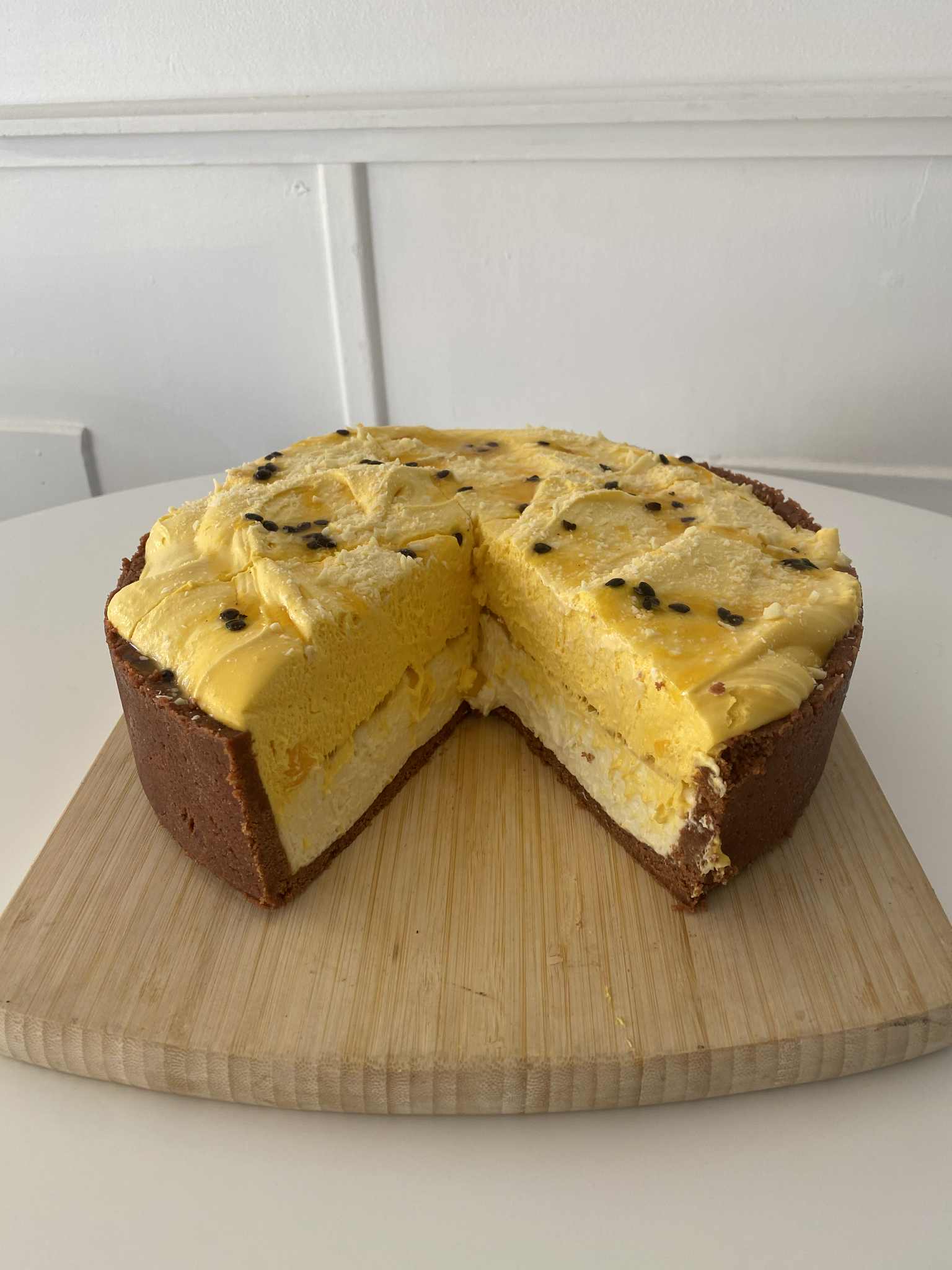 Malt Biscuit base no bake cheesecake with vanilla passionfruit mousse toppings